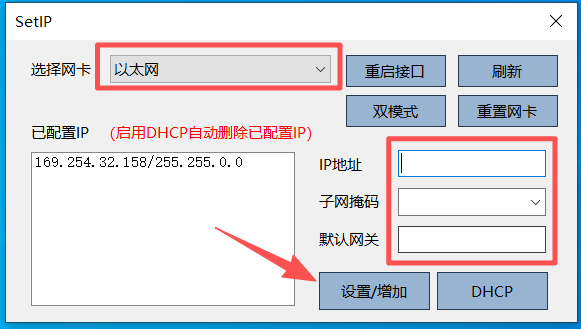 选择需要设置的网卡,输入需要设置的IP地址和子网掩码,点击设置/增加即可。